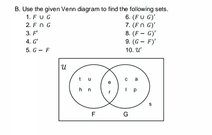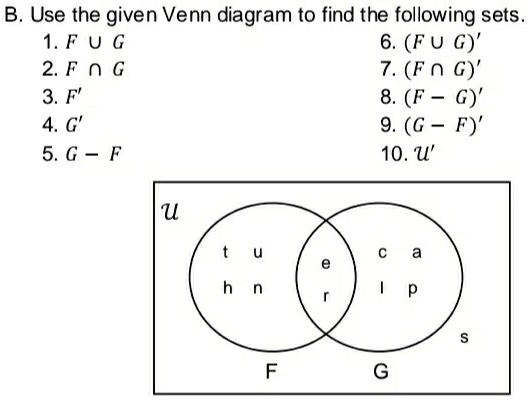 Solved B Use The Given Venn Diagram To Find The Following Sets 1 F U 6 F U G 2 F 0 G 7 Fn G 3 F 8 F G 4 G 9 G F 5 G F 10 U U