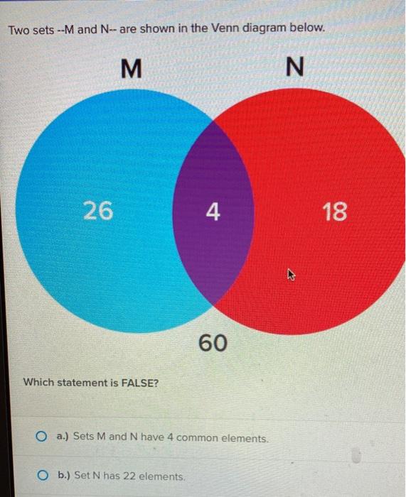 B Set N has 22 elements. We can also List the elements that are NOT in Set M. A Sets M and N have 4 common elements.
